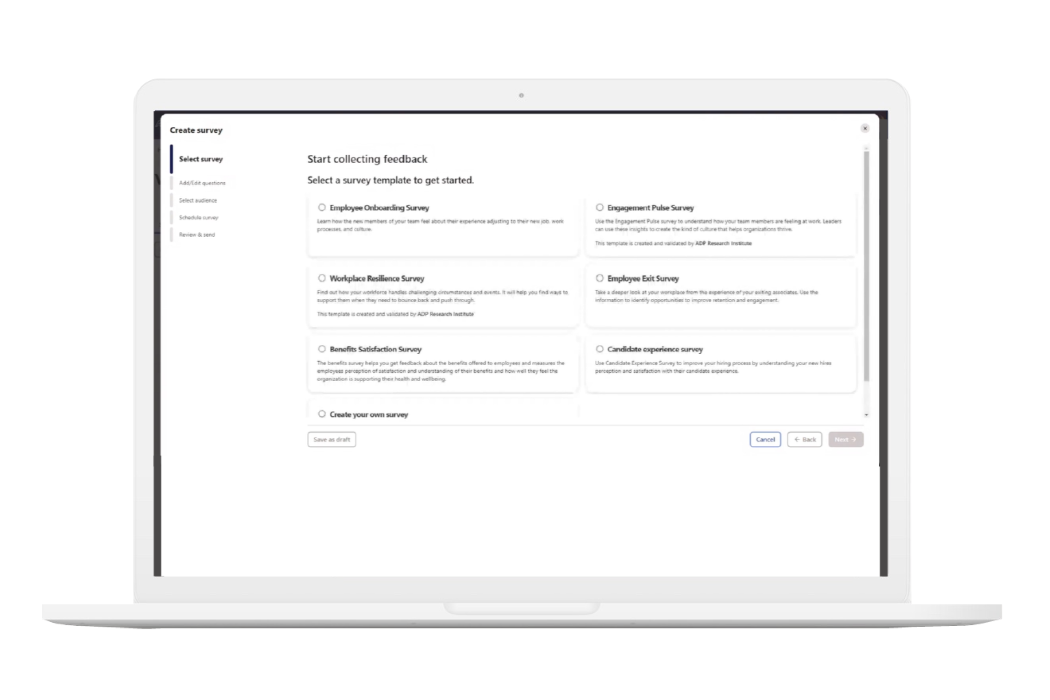 - Use scientifically validated survey templates developed in partnership with the ADP Research Institute. These templates are designed to elicit substantial and impactful feedback from your employees